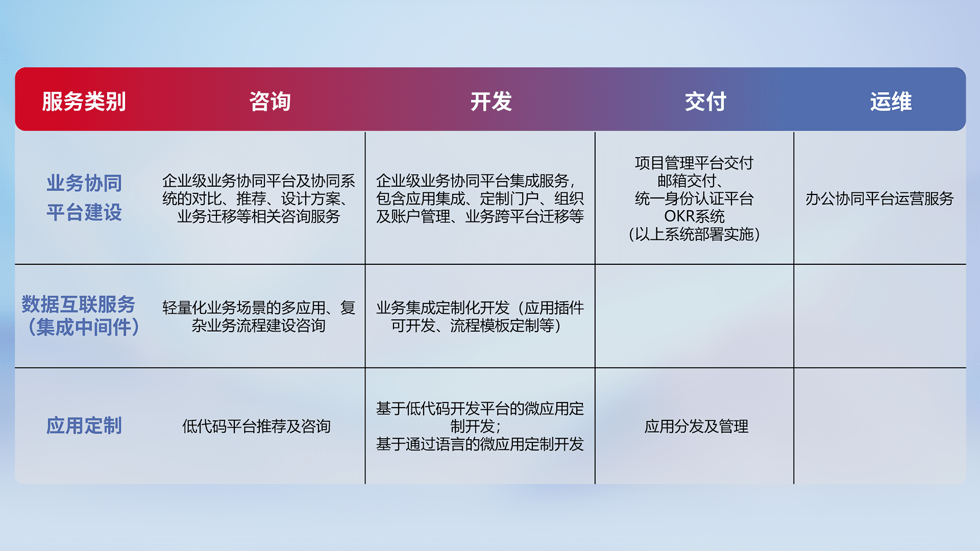 针对钉钉、、企微、、、IDaas等平台级产品提供产品的规划、、、、方案、、、交付、、定制化开发等服务,,,实现如统一协同办公、、、、智能客户服务、、混合会议管理、、、、智能数据查询、、、、等业务场景,,,,实现数字化转型。。